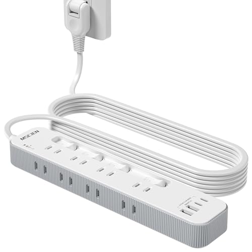エムサインの延長コード(5m)は、8口のACコンセントとUSB-A/Type-C各2口を搭載。個別スイッチ付きで使いやすく、雷ガード機能もあり、壁掛けと卓上両方に対応。PSE適合製品。