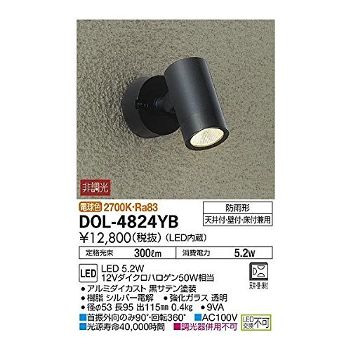 大光電機のLEDアウトドアスポットDOL-4824YBは、電球色で非調光タイプ。ダイクロハロゲン50W相当の明るさを持ち、天井・壁・床への取り付けが可能です。屋外の演出に最適なアイテムです。