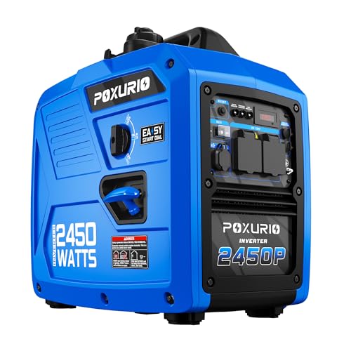 POXURIO 2450Wポータブルインバーター発電機は、1.6ガロンのガスタンクで8.3時間使用可能。超静音動作でEPA準拠、キャンプやRVに最適。