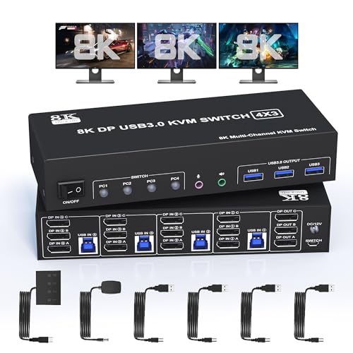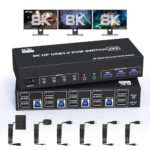 8K@60Hz、4K@144Hz対応のDisplayPort KVM切替器。3モニター、4PCに対応し、USB 3.0ポート3つ、オーディオ、マイク、キーボード、マウスを共有できます。