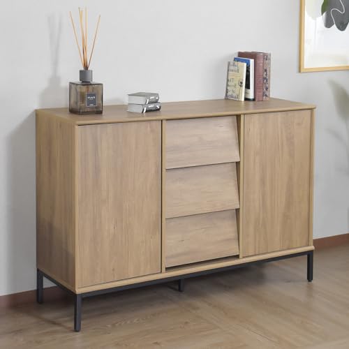 Bizdorisのキャビネットサイドボード、木製スリムデザイン。幅120cm、扉付き、可動棚でリビング収納に最適。ナチュラルな雰囲気のエリアス120cm(17474)。