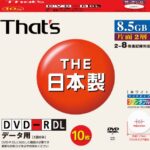 太陽誘電製のThat’s DVD-Rデータ用は、8倍速で8.5GBの片面2層ディスクです。ワイドプリンタブル対応で、5mmPケースに10枚入っています。信頼性の高い保存メディアです。
