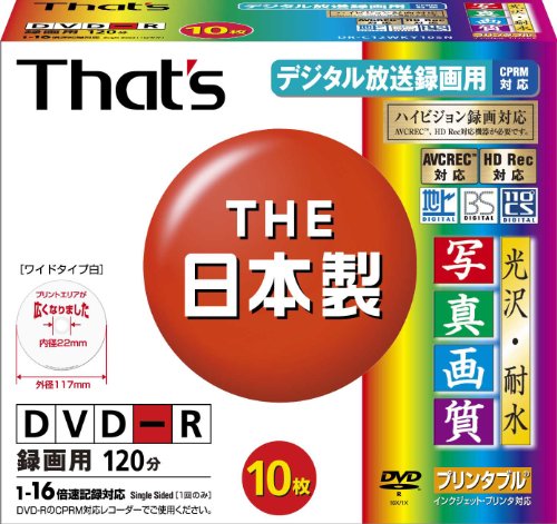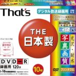太陽誘電製のDVD-Rビデオ用CPRM対応。16倍速、120分、4.7GBの容量。光沢・耐水性の写真画質で、ワイドプリンタブル対応。5mmPケースに10枚入。