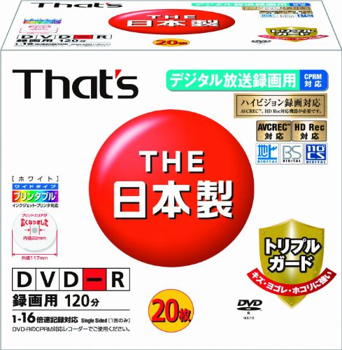太陽誘電製DVD-Rビデオ用は、CPRM対応で16倍速、120分の記録が可能な4.7GBディスクです。トリプルガードのハードコート仕様とワイドプリンタブルデザインで、5mmPケースに20枚入っています。