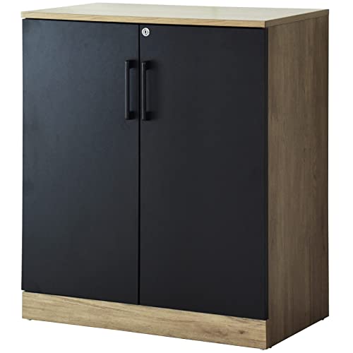 DORIS ドリスの木製キャビネット(両開き、幅80cm、高さ90cm)は、鍵付きで書類の保管に最適。ブラック×ナチュラルのデザインが特徴で、オフィス収納や書棚にも向いています。組立が必要です。
