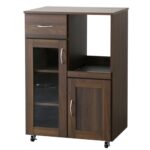 DORIS ドリスの食器棚、キッチンカウンターは幅60cm、奥行き42cm、高さ88cmのスライド棚付き。大型レンジ対応で、木製、キャスターとコンセント付きの組立式ブラウン。