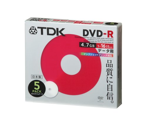 TDKの日本製DVD-Rは16倍速で書き込みが可能で、インクジェットプリンタ対応のホワイトディスクです。5mmケース入りで5枚セットのパッケージです。