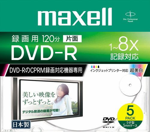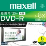 Maxellの録画用DVD-Rは1-8倍速、CPRM対応で、インクジェットプリンタにも対応。5枚パックで1枚ずつケース入り。品番はDRD120WPB.S1P5Sです。