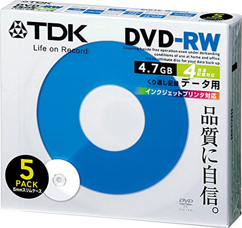 TDKのデータ用DVD-RWは、4倍速対応でインクジェットプリンタに対応したホワイトタイプ。5枚パックで、書き込みや印刷がスムーズに行えます。多様なデータ保存に最適です。