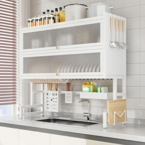 Deerou食器乾燥カゴ シンク上 大容量 4段 キッチン収納棚 カバー付き 水切りラック シンク上 台所用品ホルダ 省スペース 水切り棚 キッチン キッチン収納 コップ お椀 カトラリー 組み立て簡単 調理器具や用品の整理を容易 (ホワイト,85cm)