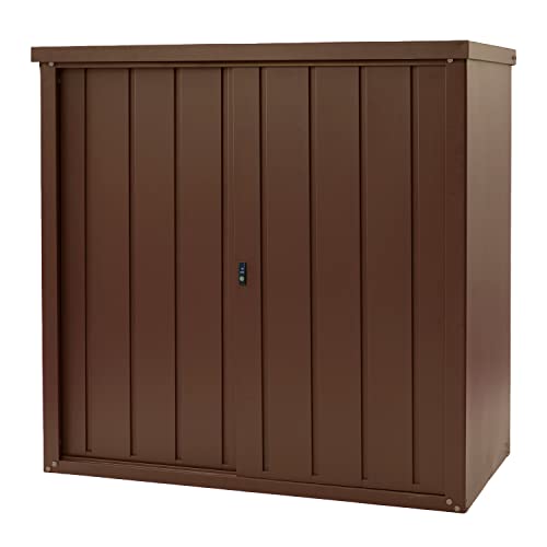 山善のガーデンマスター物置は、屋外用収納庫でおしゃれなデザイン。大型サイズ(幅150×奥行75×高さ154cm)、鍵付き、転倒防止設計、可動棚板付き。ブラウンカラーで庭やベランダに最適です。