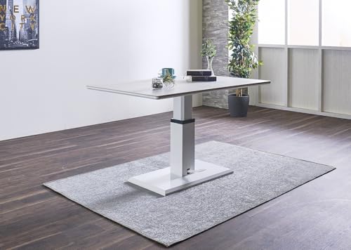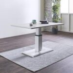 大川家具サンセーの昇降テーブル、セラミック天板120cm。リフティング機能付きで、ペダル式無段階調整可能。モダンなホワイトカラーで、ダイニングやリビングに最適です。