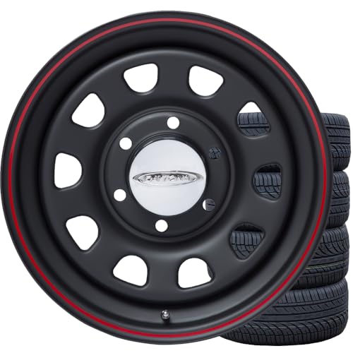 ハイエース用の15インチホイールタイヤセット。デイトナ製、ホワイトリボン195/80R15C。「マットブラック+レッドリング+メッキキャップ」付きのスチール製で、DressUpClub特注色。