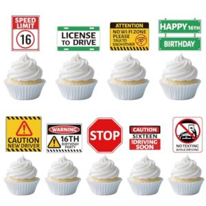 Inisajace 運転免許証 16歳の誕生日デコレーション 男の子用 16歳 Happy Bday カップケーキトッパー パーティーデコレーション 車テーマ 道路標識 カップケーキピック 装飾 16歳 学習者 ドライバー用品