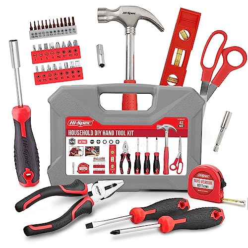 Hi-Spec 42本組 レッド 家庭用工具セットは、初心者向けのコンパクトなキットです。工具箱付きで、家庭やオフィス、バイク・車修理にも活躍します。