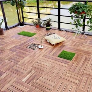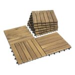 VICTORY RELAXのアカシアウッドデッキタイル9個セット。簡単にスナップインできる設計で、パティオやプールサイド、バルコニー装飾に最適。全天候型で防水、屋内外利用可(ラウンドジョイント)。