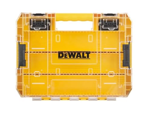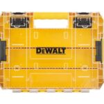 デウォルトのタフケース(大)は、デバイダー付きのオーガナイザーで、工具や小物を整理できます。透明蓋、脱着トレー、積み重ね収納が可能で、ネジやビットの収納にも便利です。