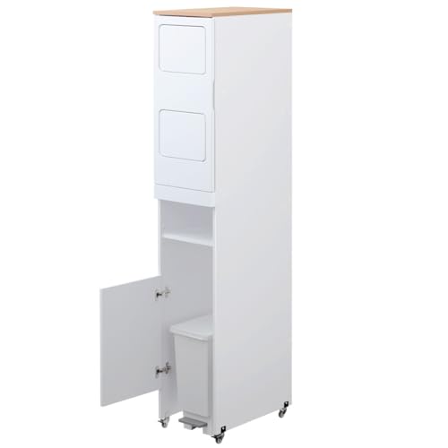ぼん家具の縦型ゴミ箱は、分別仕様で40L・45L対応、ダストボックスのサイズは幅31.6×奥行50.2×高さ180cm。キャスター付きで移動も楽々、大容量でスイング扉とペダル対応で便利。ホワイトカラーです。