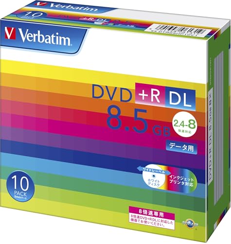 バーベイタムジャパン 1回記録用 DVD+R DL 8.5GB 10枚セット。ホワイトプリンタブルで片面2層、書き込み速度は2.4-8倍速です。高品質なメディアで、大容量データの保存に最適です。