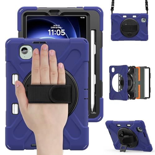 Xiaomi Pad Mini 8.8インチ用ケース。耐衝撃・ペン収納可能。360度回転スタンド、調整可能なハンド/ショルダーストラップ付き。防塵・1m落下保護で、商務や鑑賞に最適。ダークブルー。