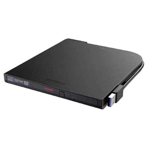 バッファローのUSB3.2(Gen1)対応ポータブルDVDドライブ、DVSM-PTV8U3-BKBは、書込ソフトが付属し、コンパクトで持ち運びしやすいデザイン。高速データ転送が可能で、ブラックのスタイリッシュな外観です。