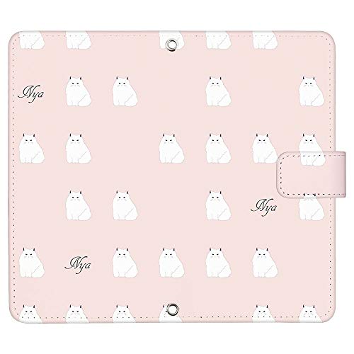 らくらくスマートフォン F-52B 対応の手帳型ケース。デザインはベビーピンクのペルシャパターンに猫のイラスト。マグネットハンド付きで使いやすく、しっかりとスマホを保護します。