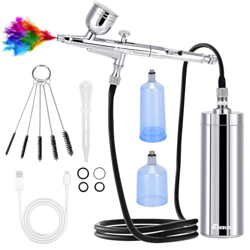 Slskbutの手持ちエアブラシキットは、32PSIの高圧を持つポータブルコードレスエアブラシ。絵画、メイクアップ、ネイルアートなどに最適なデュアルアクションエアブラシガンセットです。