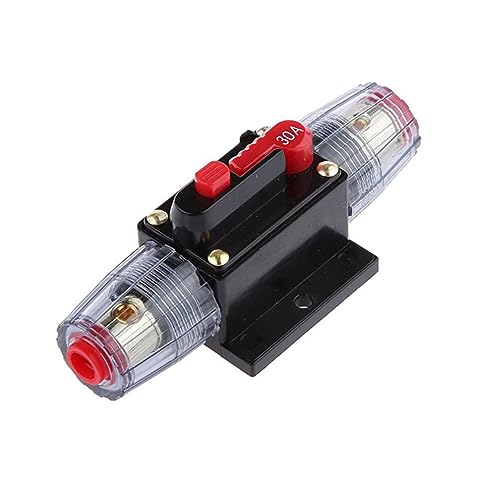 GARVALON 30A対応の手動リセット式インラインサーキットブレーカーは、車載オーディオ用に設計されており、過電流から機器を保護します。防水構造を備え、パネルへの取り付けが可能です。