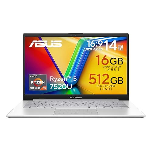 ASUS Vivobook Go 14 E1404FAは、AMD Ryzen 5 7520U、16GBメモリ、512GB SSDを搭載。14インチディスプレイ、Wi-Fi 6E、約6.1時間のバッテリー駆動で、重量は1.38kgです。