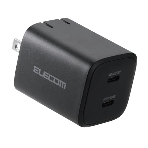 エレコムの充電器40W、2ポートType-C対応。USB PD及びPPSに対応し、GaN II技術を採用。折りたたみ式プラグでコンパクトに持ち運び可能。カラーはブラック。