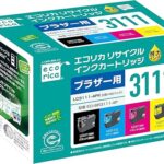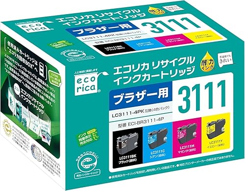 エコリカのブラザーLC3111-4PKリサイクルインクは、ブラック、シアン、マゼンタ、イエローの4色セットです。高品質で、印刷コストを抑えつつ、環境に配慮したリサイクルインクです。
