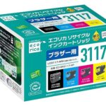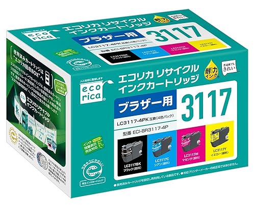 エコリカのリサイクルインク4色パックは、ブラザーLC3117-4PKに対応。対応プリンターはJ5630CDW、J6580CDWなど。環境に優しい封筒パッケージで提供されています。
