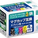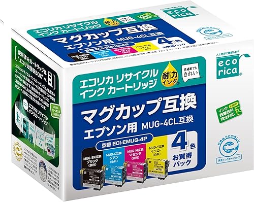 エコリカのリサイクルインク4色パックは、エプソンのMUG-4CLに対応。型番EW-052A、EW-452A用で、高品質な印刷を実現。環境に配慮した製品で、封筒パッケージに入っています。