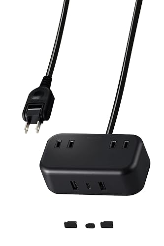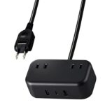 エレコムの電源タップは、雷ガード付きで1.5mのケーブル長。2個口でUSB-Aポート(2つ)とUSB-Cポート(1つ)を搭載し、合計32W出力。卓上使用に最適で、出張や旅行に便利なUSBポート用キャップ付きのブラックモデル。