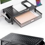 イーサプライのモニター台はA4サイズ対応で、幅37cm、奥行23.5cm、高さ調整が3段階可能。スチール製で耐荷重は15kg、引き出し付きのコンパクトなブラックデザインです。