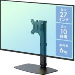イーサプライのモニタースタンドは27インチまで対応し、耐荷重6kg、360度回転可能。高さ変更や上下左右可動で快適な視界を提供します。VESA規格対応、ブラックのデザインです。