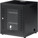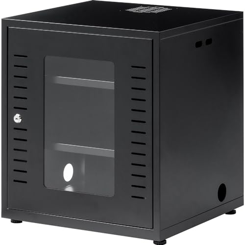 イーサプライの機器収納ラックは、鍵付きでネットワーク機器の収納に適しています。サイズは幅45cm、奥行42cm、高さ51cmで、棚板が2枚付属。小型でブラックカラーです。