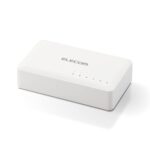エレコムの5ポートギガビットスイッチングハブ。コンパクトで軽量、ACアダプター付属。壁掛け設置対応、静音ファンレス、省電力設計。EU RoHS指令準拠のホワイトモデル。