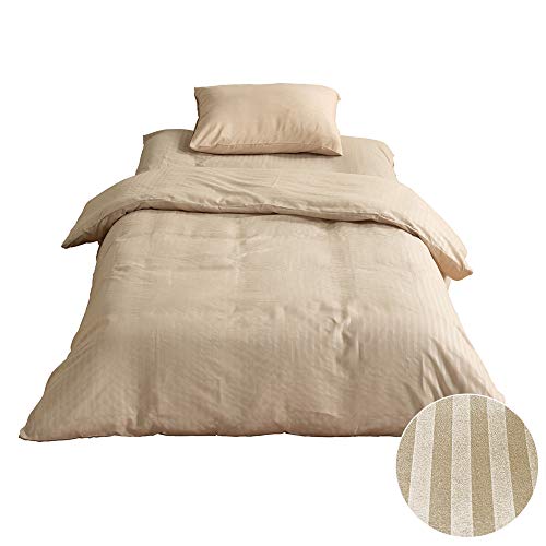EiYUの布団カバー3点セットは、シングルサイズでベージュのサテン調ストライプデザイン。掛け布団カバー、ボックスシーツ、枕カバーが含まれ、肌触りが良く、寝室の雰囲気をおしゃれに演出します。