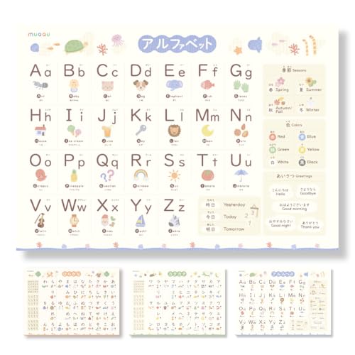 MUQQUのお風呂ポスターは、ひらがな・カタカナ・アルファベットを学べる知育ポスターです。日本製で防水仕上げ、B3サイズのデザインはおしゃれで、幼児の学習を楽しくサポートします。