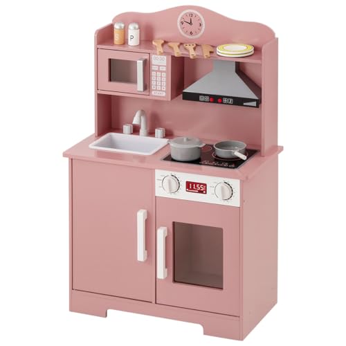 ぼん家具の木製おままごとキッチンは、完成品で音と光が楽しめる道具を含む10点セットです。流し台や電子レンジ、オーブン、コンロ、収納扉が付いており、子供の知育やプレゼントにも最適なピンク色の製品です。