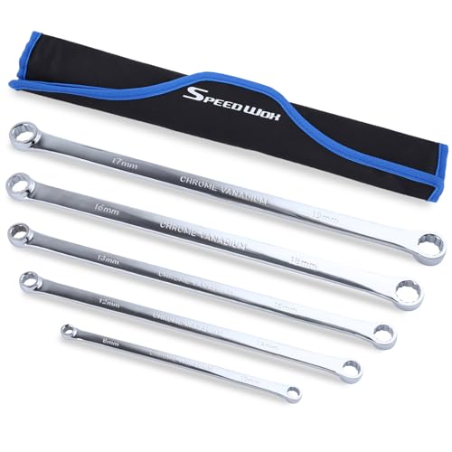 SPEEDWOXの超長レンチセットは、8mmから19mmまでのサイズを含む5本組のダブルボックスエンドレンチです。0度オフセット、ミラー仕上げで、収納袋付き。ロングタイプで使いやすさ抜群です。