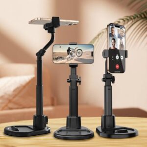 デスク用携帯電話スタンド、360°回転角度高さ調節可能な電話ホルダー 安定したメタルベース 滑り止め録音チャット傾斜スタンド 格納式携帯電話スタンド オフィスアクセサリー、4.7インチ~7インチ、ブラック。