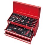 イーバリューの整備工具セットEST-2280REは、80点の工具とツールチェストがセットになっており、EVAマットトレー仕様でバイクや自動車のメンテナンス作業に対応しています。