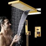 ラグジュアリーゴールデン壁取り付けシャワー蛇口セット。レインフォールシャワーヘッドとABSハンドシャワーを搭載。3ウェイミキサータップでおしゃれなバス体験を提供。