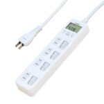 EXHEARTの賢く節電ワットメーター付タップは、4個口、2mのホワイトタイプ。消費電力、電気代、CO2を表示。スイングプラグ、個別スイッチ、雷サージ、ホコリ防止シャッター機能付き。モデル番号はETA-NWM620-WまたはETA-NWM420-Wです。