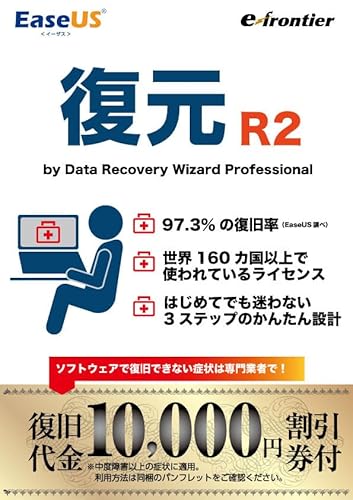 イーフロンティアのEaseUS復元 R2は、データ復元ソフトウェアで、WindowsまたはMac用の1ライセンス版です。削除されたファイルやフォルダ、パーティションの復元が可能で、使いやすいインターフェースが特徴です。