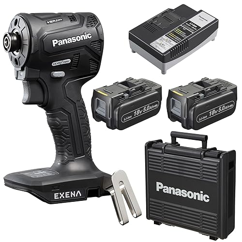 パナソニック 充電インパクトドライバー EXENAは、18Vと14.4V対応のデュアルシステム。電子クラッチ搭載で精密作業も可能。5.0Ah電池パック×2、充電器、プラスチックケース付き。