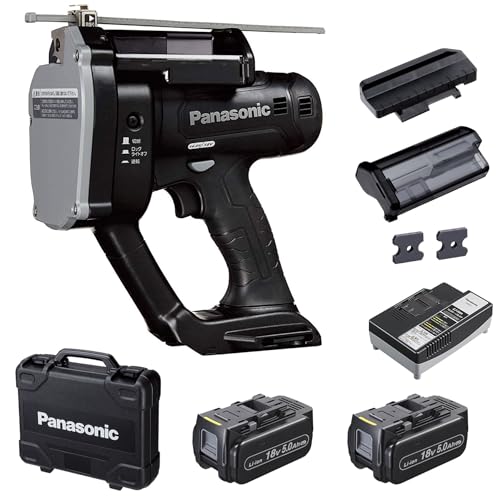 パナソニックの充電全ネジカッターEZ45A8LJ2G-Bは、18Vの5.0Ah電池パック×2個、充電器、ケース付き。14.4V/18V対応で、最小切断20mmの黒色モデルです。