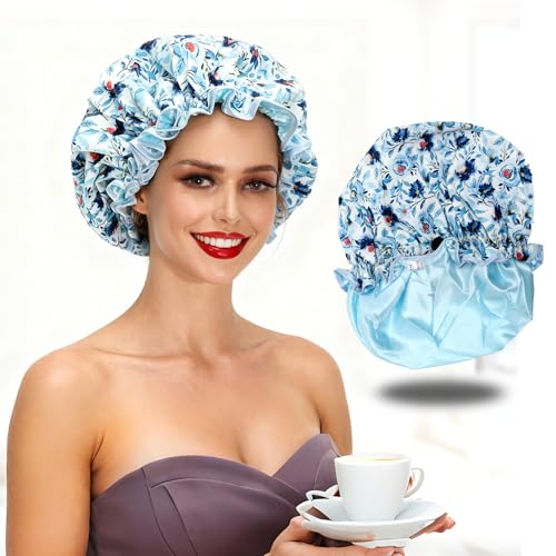 再利用可能なラグジュアリーシャワーキャップ。防水でダブルレイヤー、調節可能なゴムストラップあり。サテン裏地で全ての髪の長さに対応。ギフトにも最適なブルーフラワー柄。